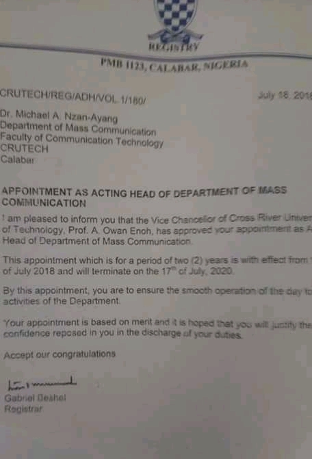 Michael Nzan of the Department of Mass Communication, CRUTECH, was appointed HOD of the department a little above one week after Obonganwan Edim, the HOD, passed away. Nzan’s letter of appointment as HOD, with reference number, CRUTECH/REG/ADH/Vol 1/180, and signed by the institution’s registrar, Gabriel Beshel, was issued on July 16, 2018. While friends, colleagues and well wishers congratulated the new HOD, sources within the institution told www.calitown.com that some of Nzan’s colleagues protested against this appointment to the school authorities.