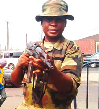 Paraded by soldiers of the 323 Artillery Brigade, Nigeria Army, Akure, Ondo state, following a tip-off the military received from her estranged lover, Omieh, according to the Public Relations Officer of the brigade, one Captain Ademola Adegoke, was picked up after her lover discovered that she faked membership of the Nigerian Army. In her possession at the time of her arrest were two camoflague T-shirts, a pair of shorts, one jungle hat, a pair of jungle boots and three handsets.