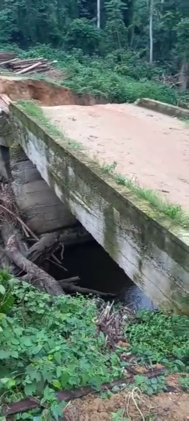 An elderly woman, sandwiched between a commercial motorcyclist and wares she travelled out of the community to buy, can be seen uncomfortably sitting on the motorcycle as they take a plunge down one dangerous collapsed bridge.