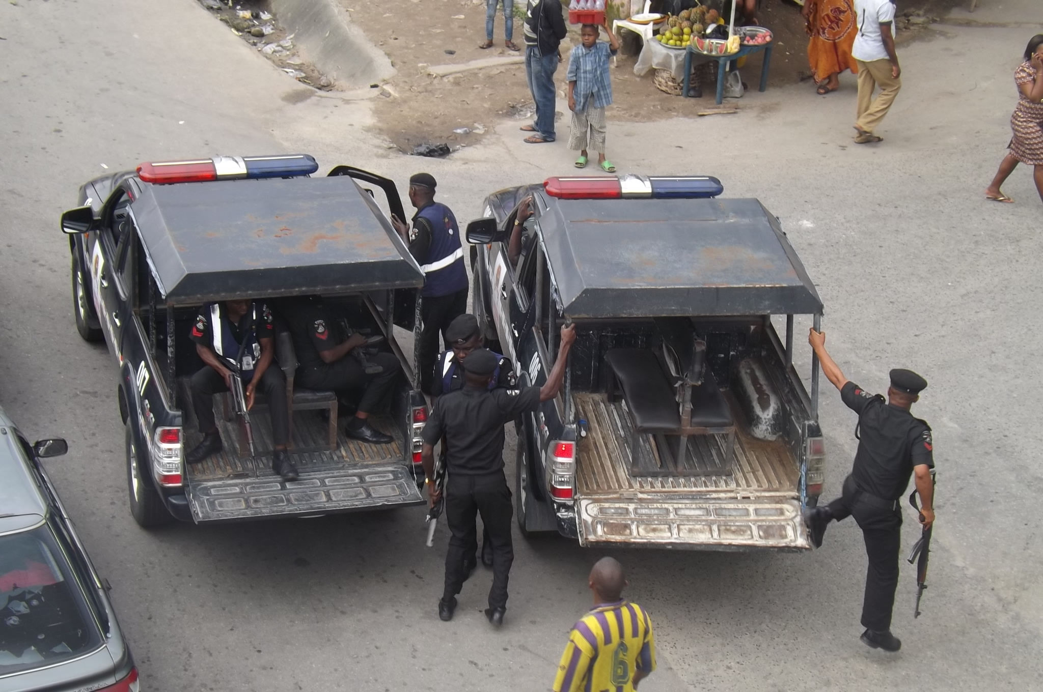 Policemen arriving Marian Road to help disperse the protesting taxi men